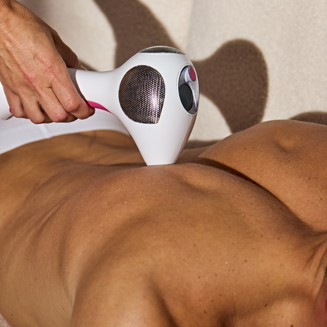 The entire back, including shoulders, can be treated with an at-home laser hair removal device such as the Tria 4X Hair Removal Laser. However, moles, tattoos, or broken skin should be avoided.