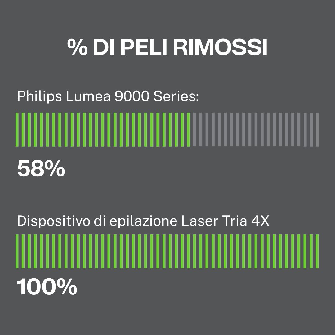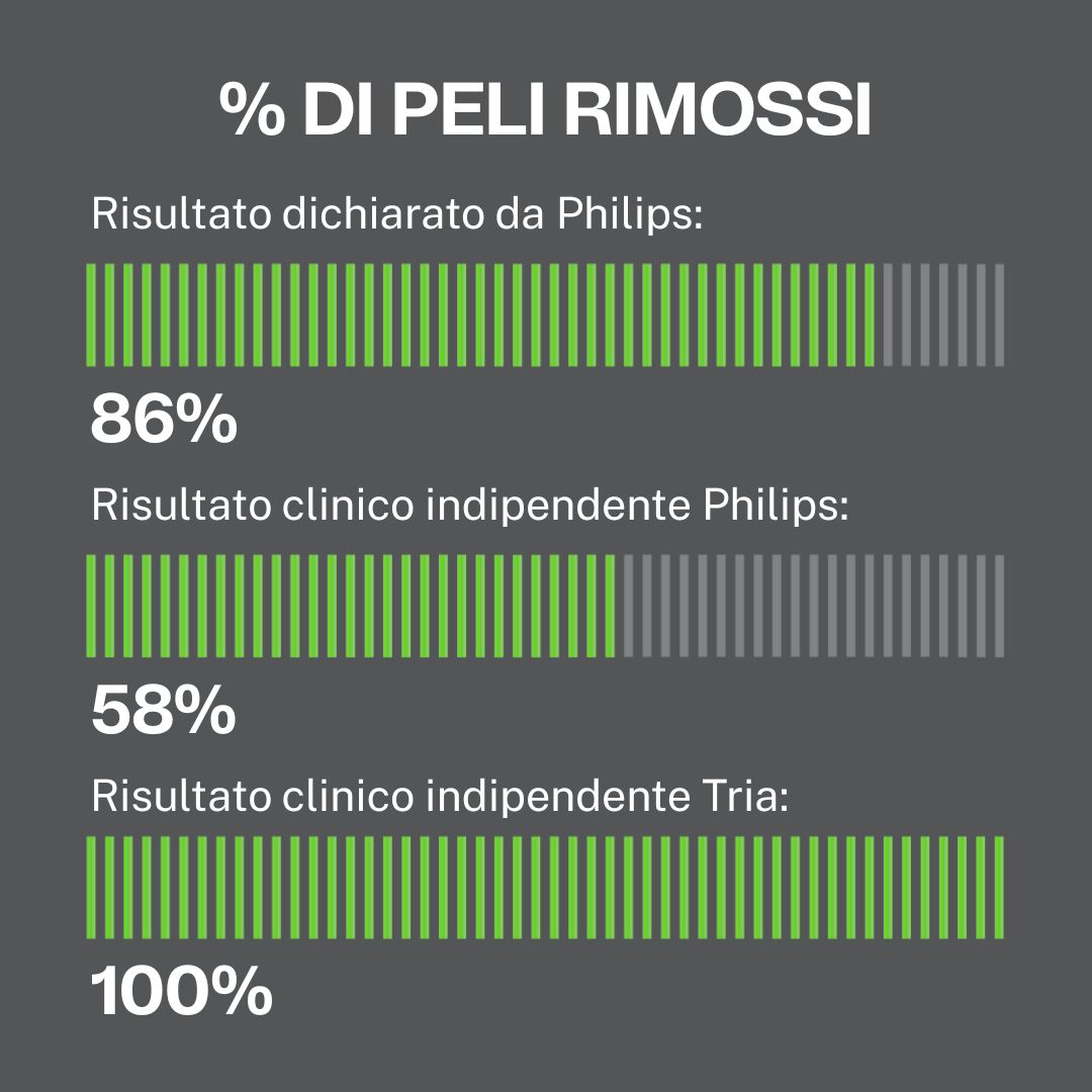 Philips offre un'ottima soluzione per l’epilazione, consentendo di risparmiare denaro rispetto ai trattamenti professionali. Tuttavia, Tria offre risultati di livello professionale direttamente a casa, clinicamente testati per una rimozione dei peli fino al 100%**, il che lo rende la soluzione migliore per l'epilazione a casa.
