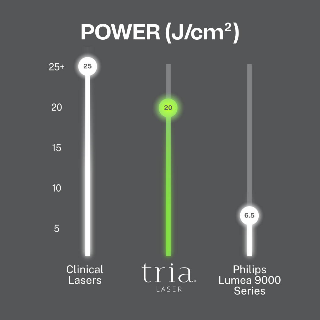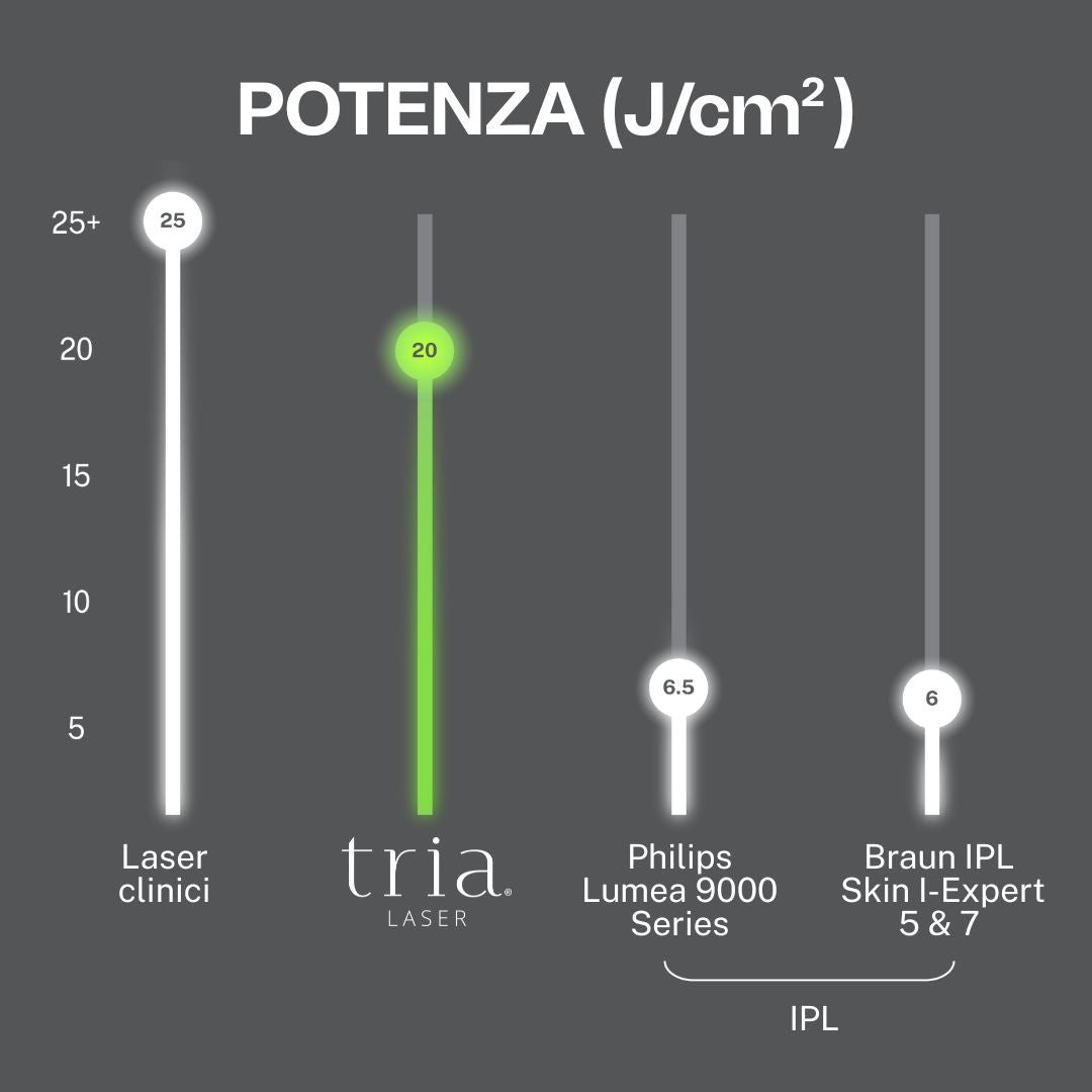 Philips Lumea 9000 emette 6,5 J/cm², mentre il Dispositivo di Epilazione Laser Tria 4X utilizza 20 J/cm² per impulso, ovvero oltre il triplo di quanto può produrre Philips Lumea 9000, garantendo un laser più potente e risultati migliori.