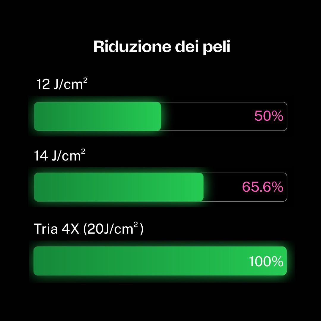 - Tria 4X si attesta a 20 J/cm² con utenti che riportano fino al 100% di riduzione dei peli.**